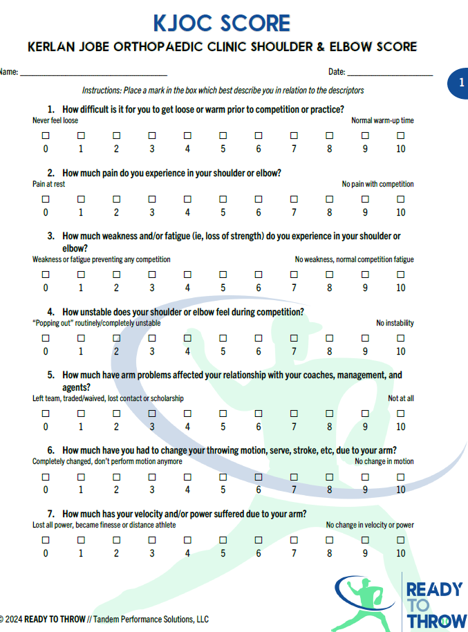 The Kerlan-Jobe Orthopaedic Clinic Shoulder & Elbow Score (KJOC) provides questions for the overhead athlete that can aid with determining if someone is throwing with or without pain. Initially only validated for professional and high-level throwers, the KJOC can now differentiate between younger baseball athletes throwing with and without pain. The predictive threshold score can be used in a clinical setting to aid with determining if a youth or high school-aged athlete is suffering from pain while participating in overhead throwing, and to guide rehabilitation management.