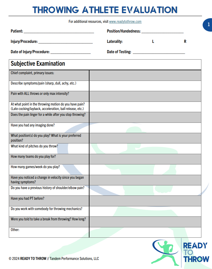 Working with throwing athletes requires a critical eye and specialized testing to truly ascertain limitations or faults that could potentially leady to injury or inhibit performance. On this page, we’ve compiled a collection of comprehensive tools designed to assess and analyze various aspects of throwing athletes’ performance and health. Whether you’re a coach, athlete, or healthcare professional, these downloadable forms provide valuable insights into strength, motion, function, mechanics, etc.